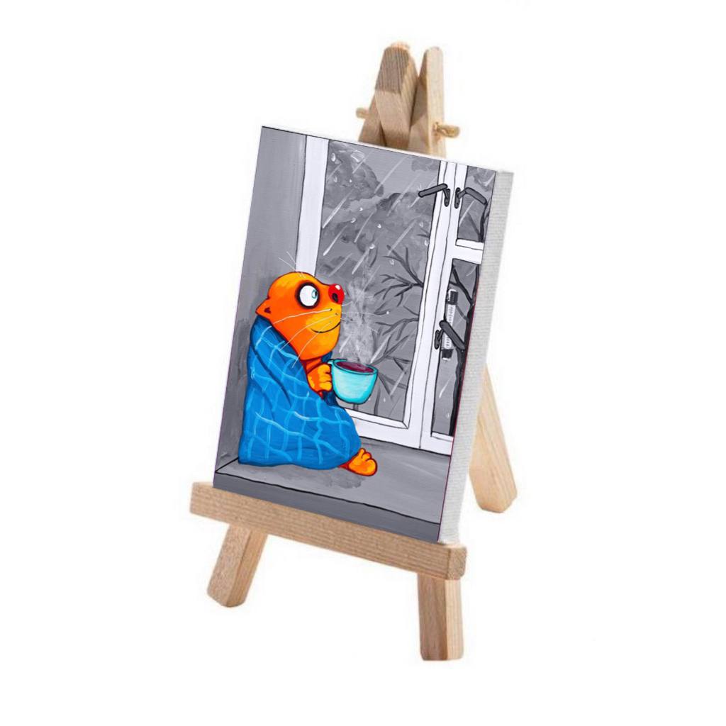 Деревянный настольный минимольберт, с установленным на нем мини холстом с изображением картины Васи Ложкина.